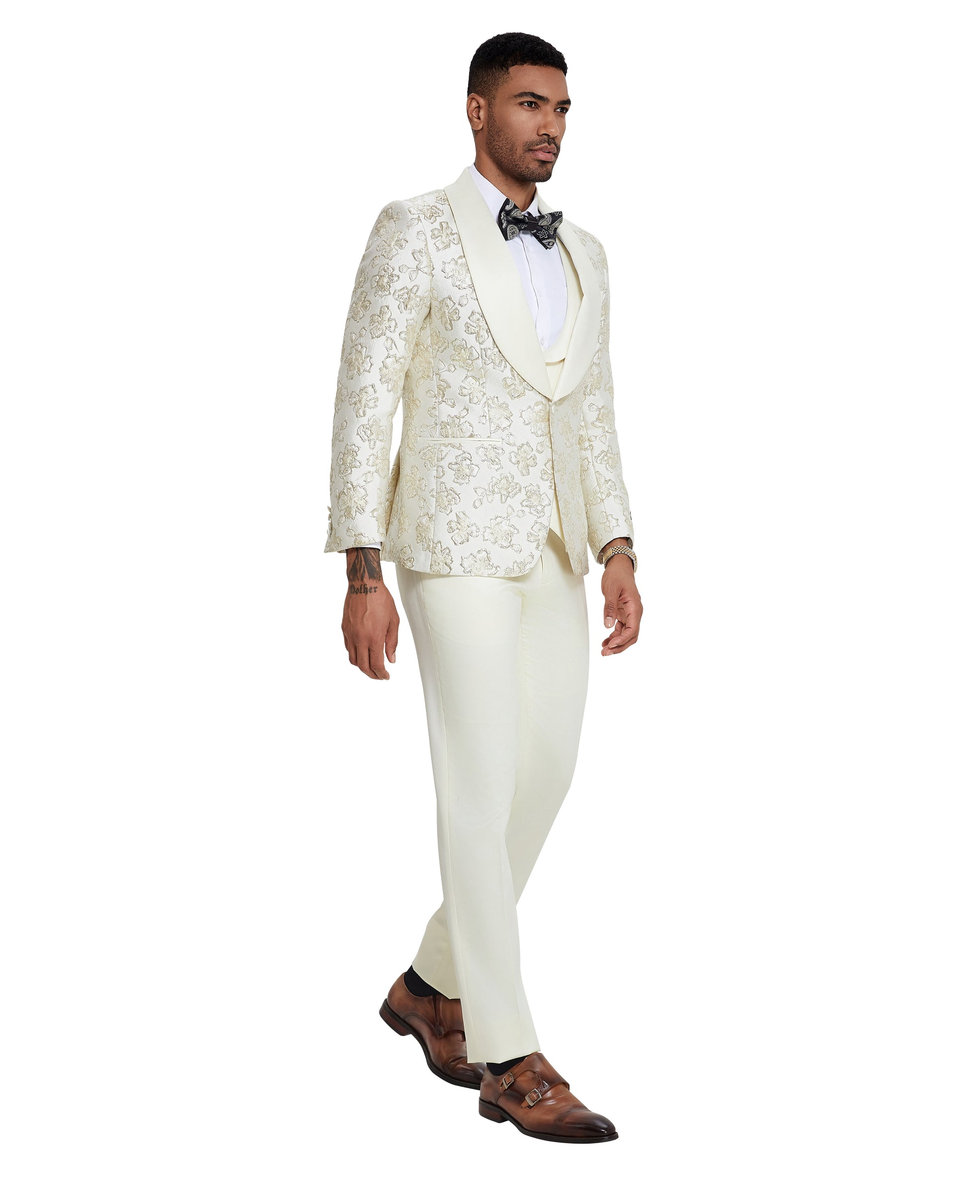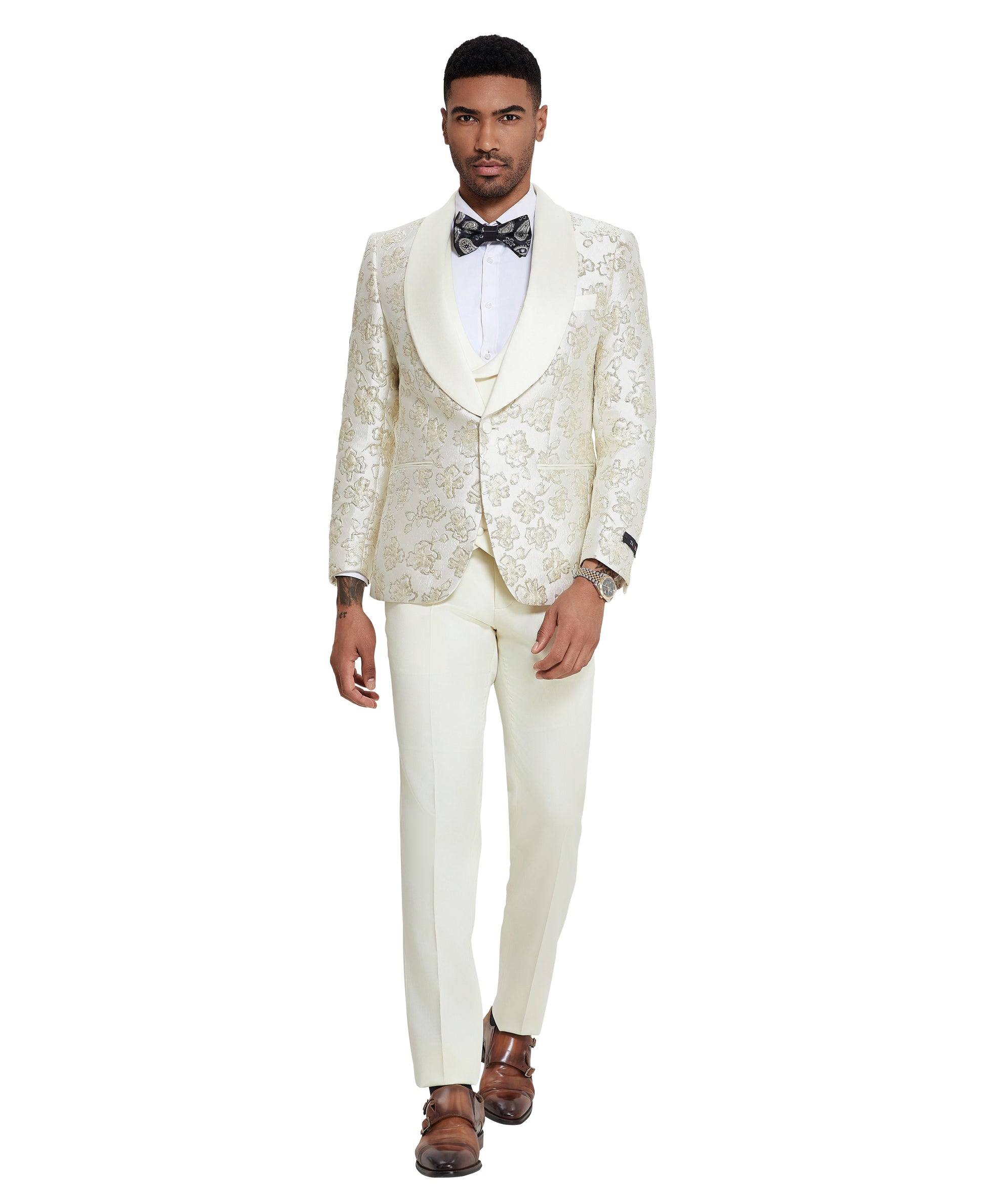 3 PC Floral Satin Shawl Collar Double Breasted Suit