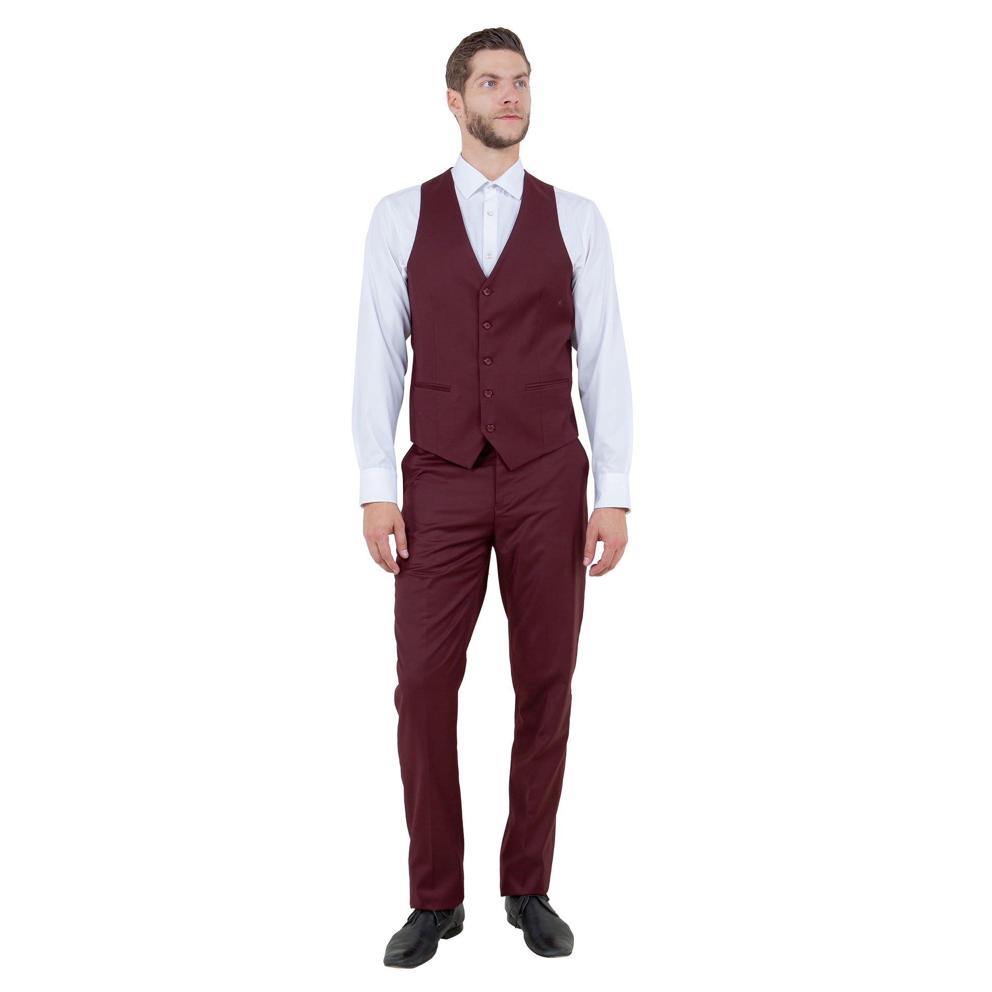 Step into sophistication with the Men's Tazzio Slim-Fit 3pc Suit in rich burgundy by Tazio. Meticulously tailored, the jacket features a slim fit, slim notch lapel, and two-button closure with side vents for comfort. The coordinating vest and flat front pants complete the ensemble, boasting practicality and elegance. Perfect for formal events or business meetings, this suit ensures you make a lasting impression.