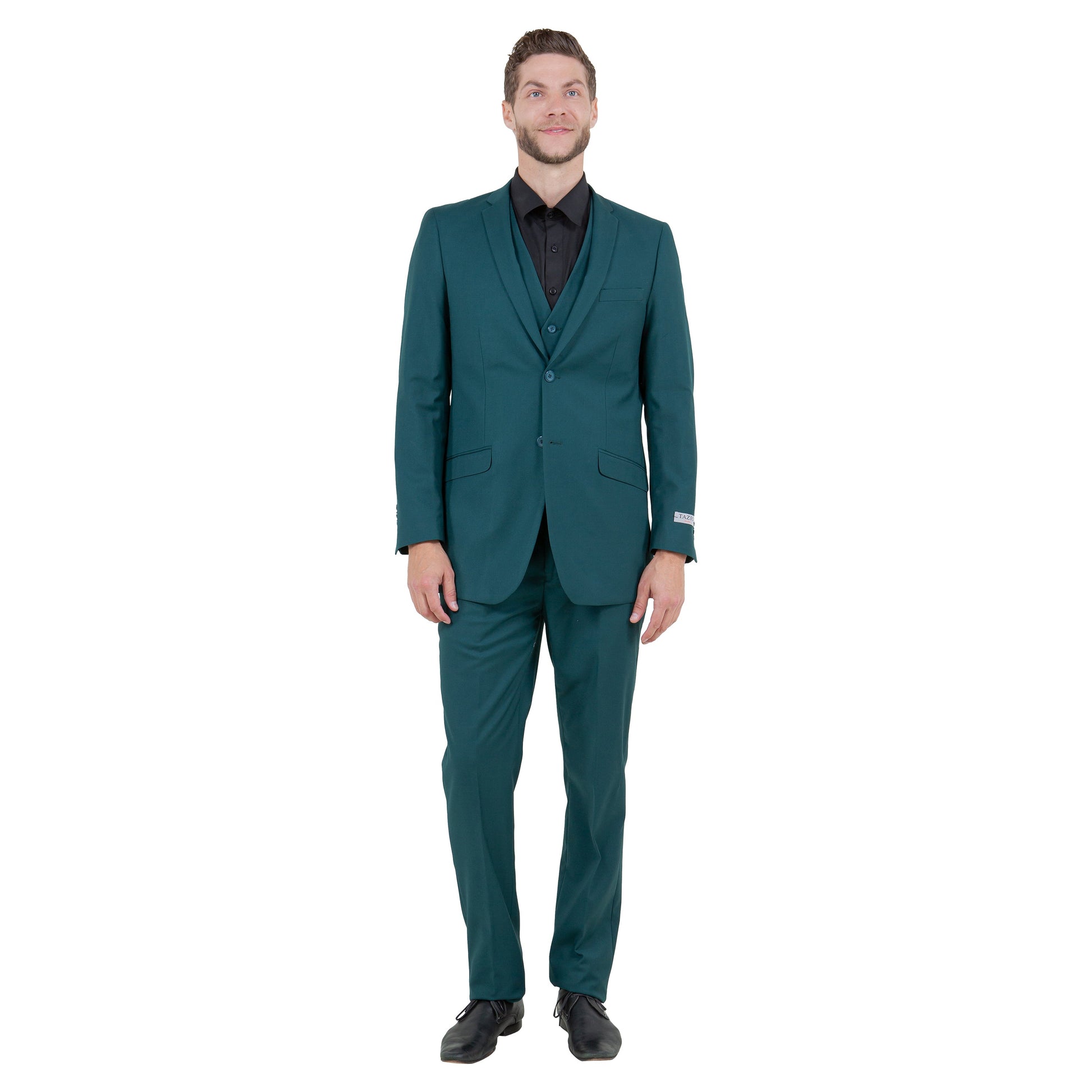 Step into sophistication with the Men's Tazzio Slim-Fit 3pc Suit in the striking tidepool shade by Tazio. Meticulously tailored, the jacket boasts a slim fit, slim notch lapel, and two-button closure, alongside side vents for comfort. Completing the ensemble, the coordinating vest and flat front pants ensure both practicality and elegance. Perfect for formal events or business meetings, this suit promises to leave a lasting impression.