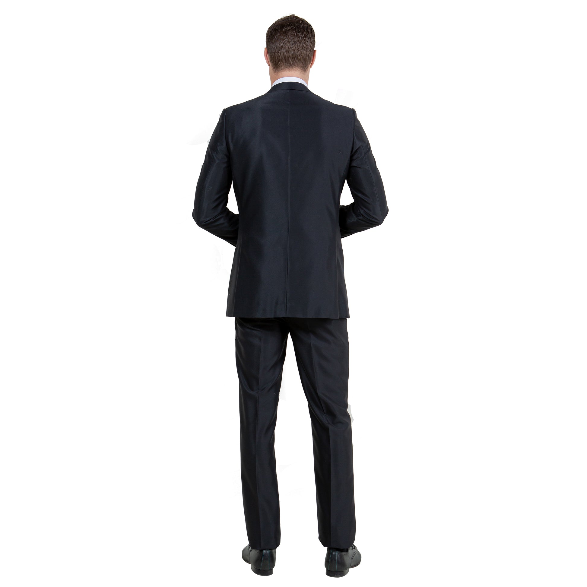 Elevate your formal attire with the Men's Tazio Slim-Fit 3pc Suit in Shiny Black. Crafted with precision by Tazio, this ensemble exudes sophistication and style. The Solid Sharkskin jacket features a Slim Fit, Two Button Front Closure, Notch Lapel, and convenient Side Vents, while the vest adds a polished touch with its Five Button closure and V Neck design. Completing the look, the coordinating Solid Sharkskin pants offer a sleek Flat Front design, 37 Inch Inseam, and practical features like back besom pockets with button closure and front angled slip pockets. Perfect for weddings, galas, or formal business events, this suit guarantees a timeless and elegant appearance with every wear.