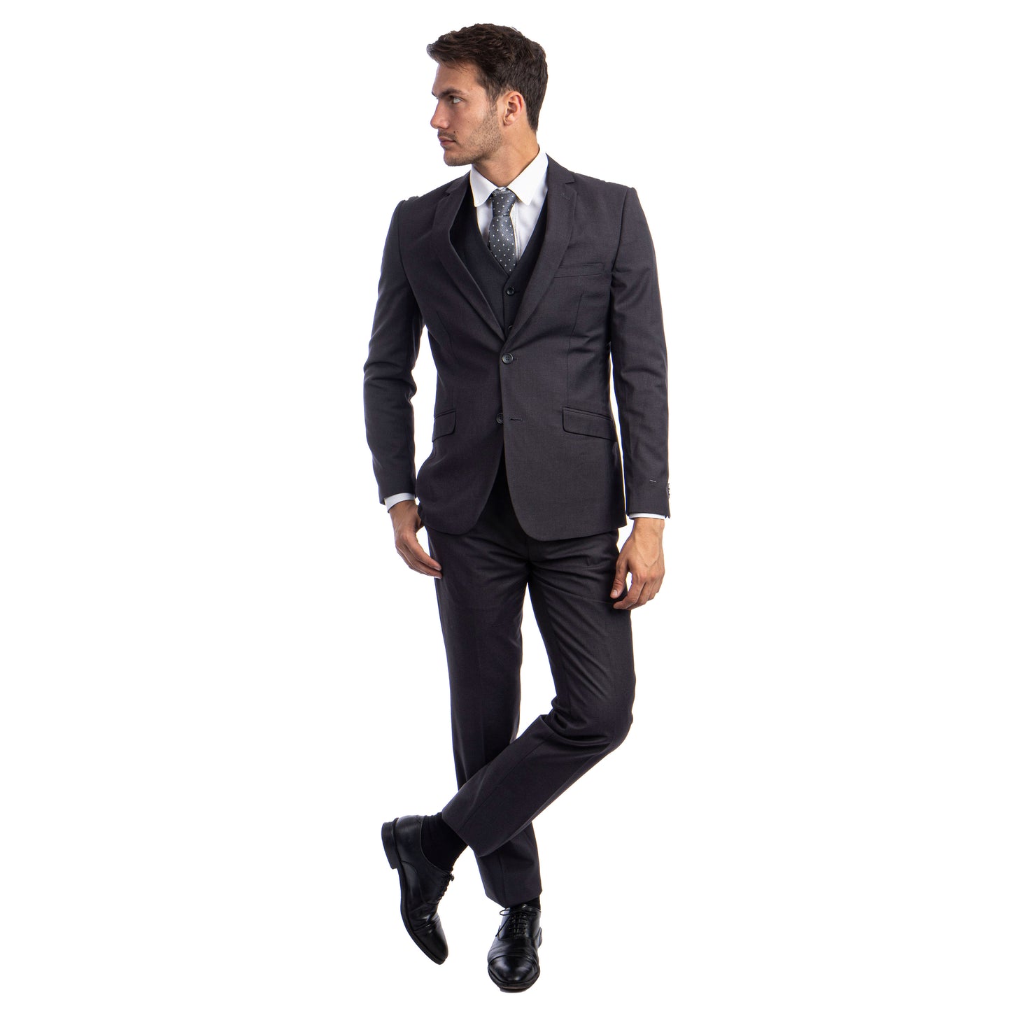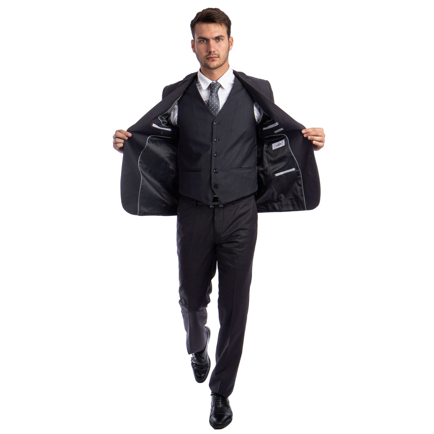 The Azzuro Men's Slim-Fit 3pc Suit in sophisticated charcoal. This versatile ensemble offers both style and sophistication. The jacket features a two-button front closure, slim notch lapel, and underarm sweat guards for comfort. With ample storage, including two besom front pockets and three interior pockets, functionality meets fashion. The accompanying vest adds elegance with its five-button closure and slit pockets. The flat-front pants, lined to the knee, provide a tailored fit with convenience in mind. Crafted from 100% polyester, this suit combines durability with timeless appeal. Elevate your wardrobe effortlessly with the Azzuro Men's Slim-Fit 3pc Suit.