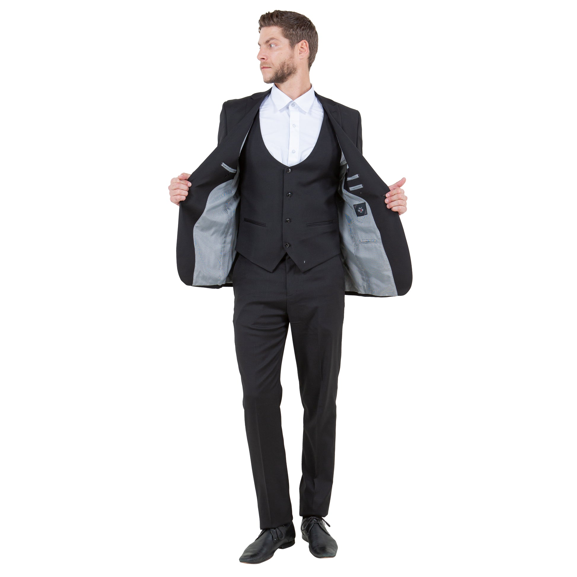 Introducing the Tazzio Men's Ultra Slim-Fit 3pc Suit with Expandable Waistband in Classic Black���a pinnacle of sophistication and practicality. The jacket boasts a slim notch lapel, two-button closure, and underarm sweat guards for comfort, alongside interior pockets for convenience. The V-neck vest complements with a five-button closure and two slit pockets, while the flat front pants feature an expandable waistband, ample storage, and a zip fly for ease. Perfect for any occasion, this ensemble effortlessly combines style and functionality for the modern gentleman.