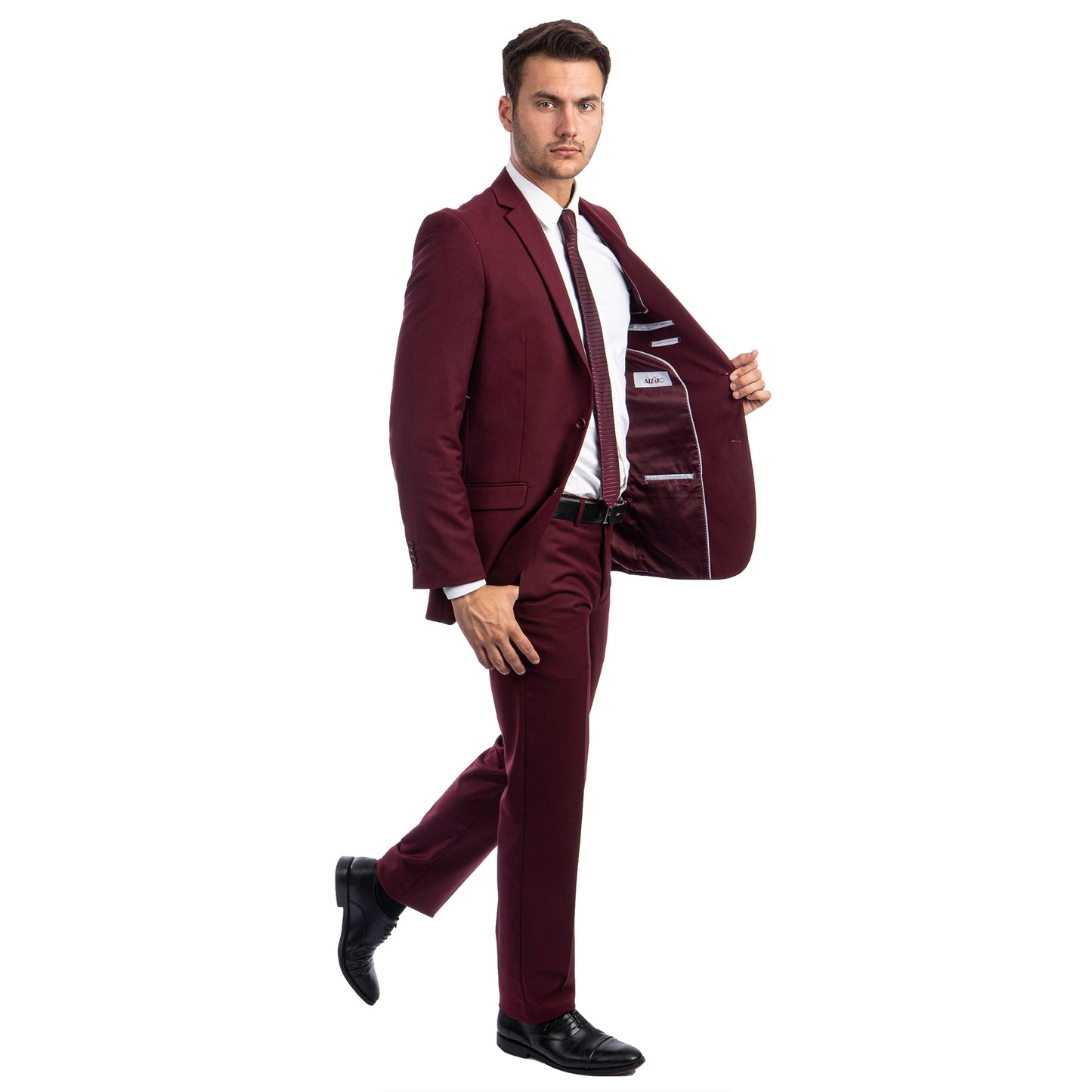 Crafted with precision, the Azzuro Men's Slim-Fit Polyester Suit 2-Piece in burgundy seamlessly blends traditional elegance with contemporary sophistication. The single-breasted jacket showcases a timeless notch lapel, two-button closure, and functional side flap pockets, while the slim-fit pants offer a sleek flat front design. Constructed from premium 100% polyester fabric, this ensemble delivers impeccable style and lasting comfort. Whether for business meetings or formal events, the Azzuro suit epitomizes effortless refinement, ensuring you make a memorable impression at every occasion.