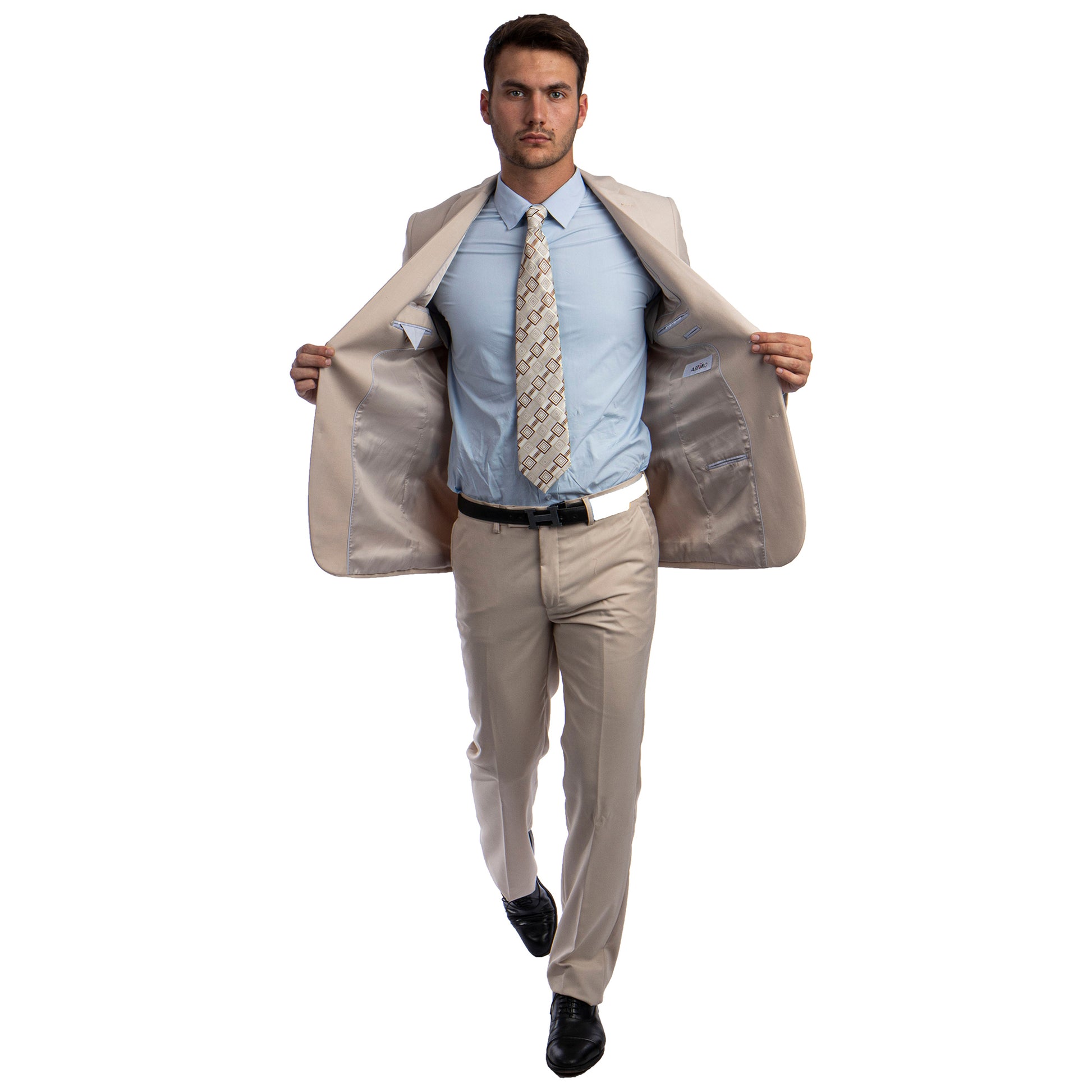Crafted with precision, the Azzuro Men's Slim-Fit Polyester Suit 2-Piece in tan seamlessly blends traditional elegance with contemporary sophistication. The single-breasted jacket showcases a timeless notch lapel, two-button closure, and functional side flap pockets, while the slim-fit pants offer a sleek flat front design. Constructed from premium 100% polyester fabric, this ensemble delivers impeccable style and lasting comfort. Whether for business meetings or formal events, the Azzuro suit epitomizes effortless refinement, ensuring you make a memorable impression at every occasion.